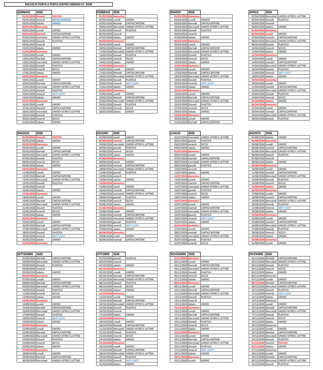 Per garantire massima chiarezza, il Comune ha già pubblicato online i nuovi calendari di raccolta per l’anno 2026, differenziati per tipologia di utenza e zona: