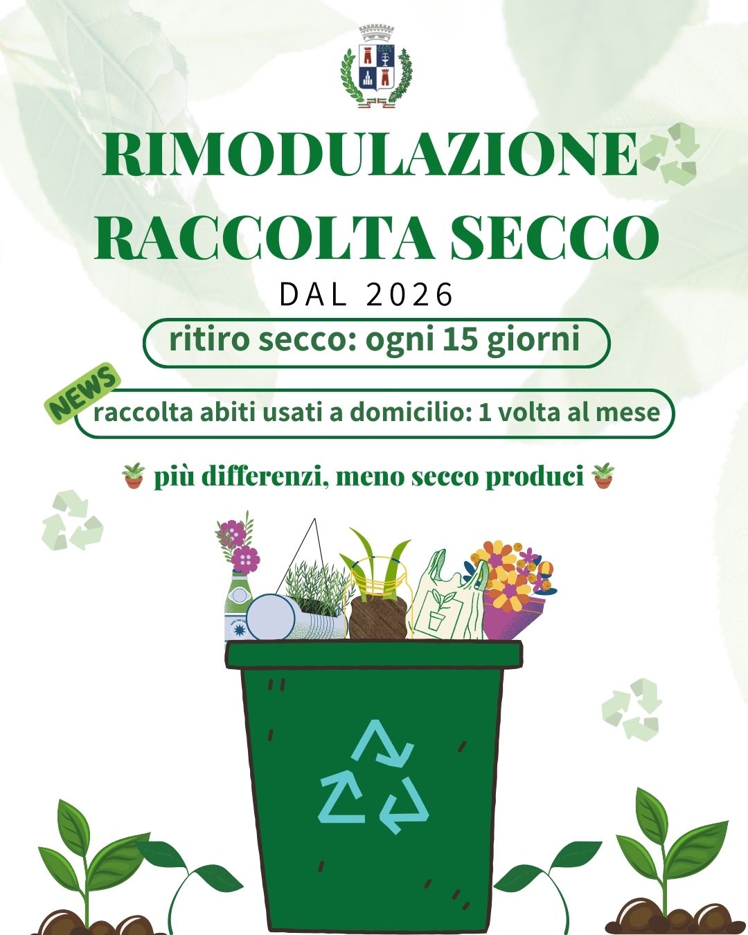 A partire dal 2026, la raccolta del rifiuto secco residuo passerà da una volta a settimana a una volta ogni quindici giorni. Una decisione presa dopo aver constatato che, negli ultimi sei mesi, la quantità di secco prodotta si è notevolmente ridotta, a favore di una maggiore differenziazione.